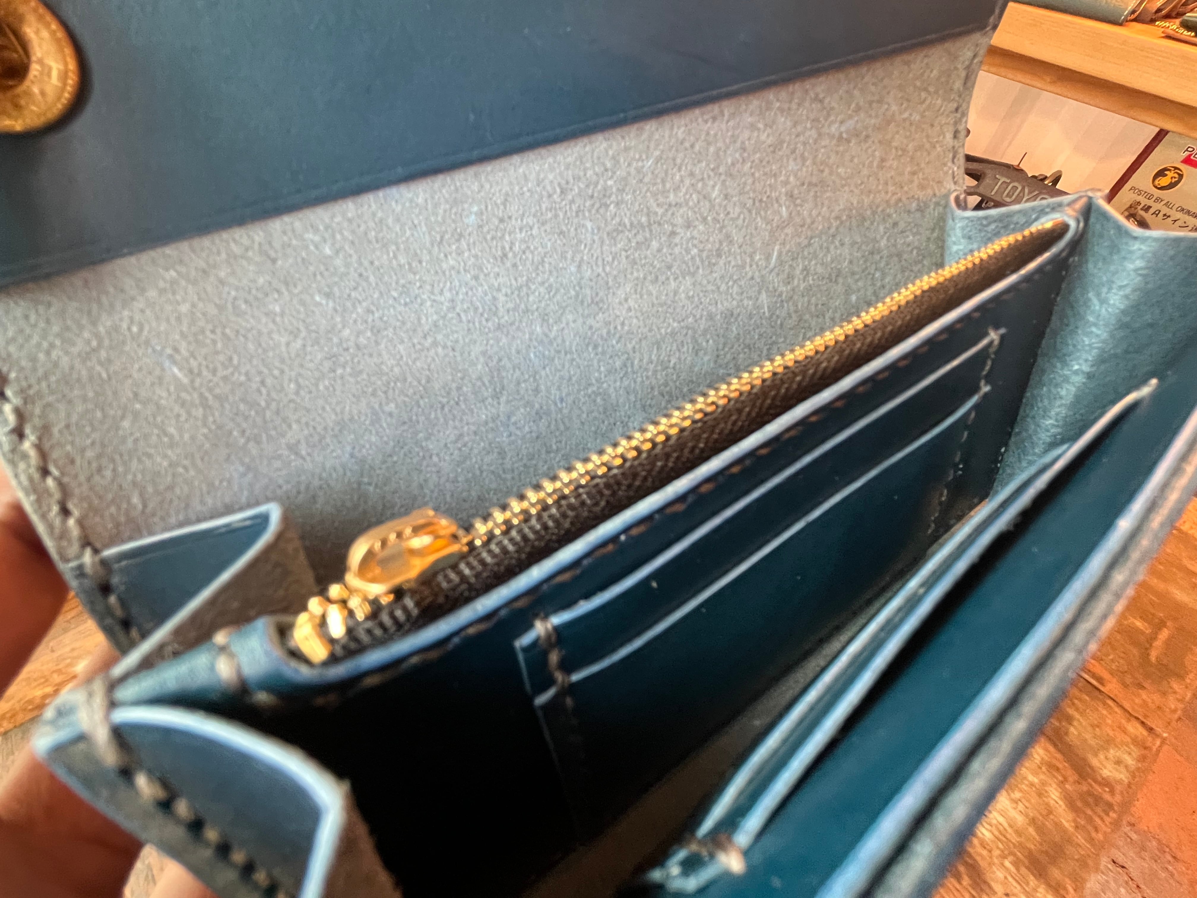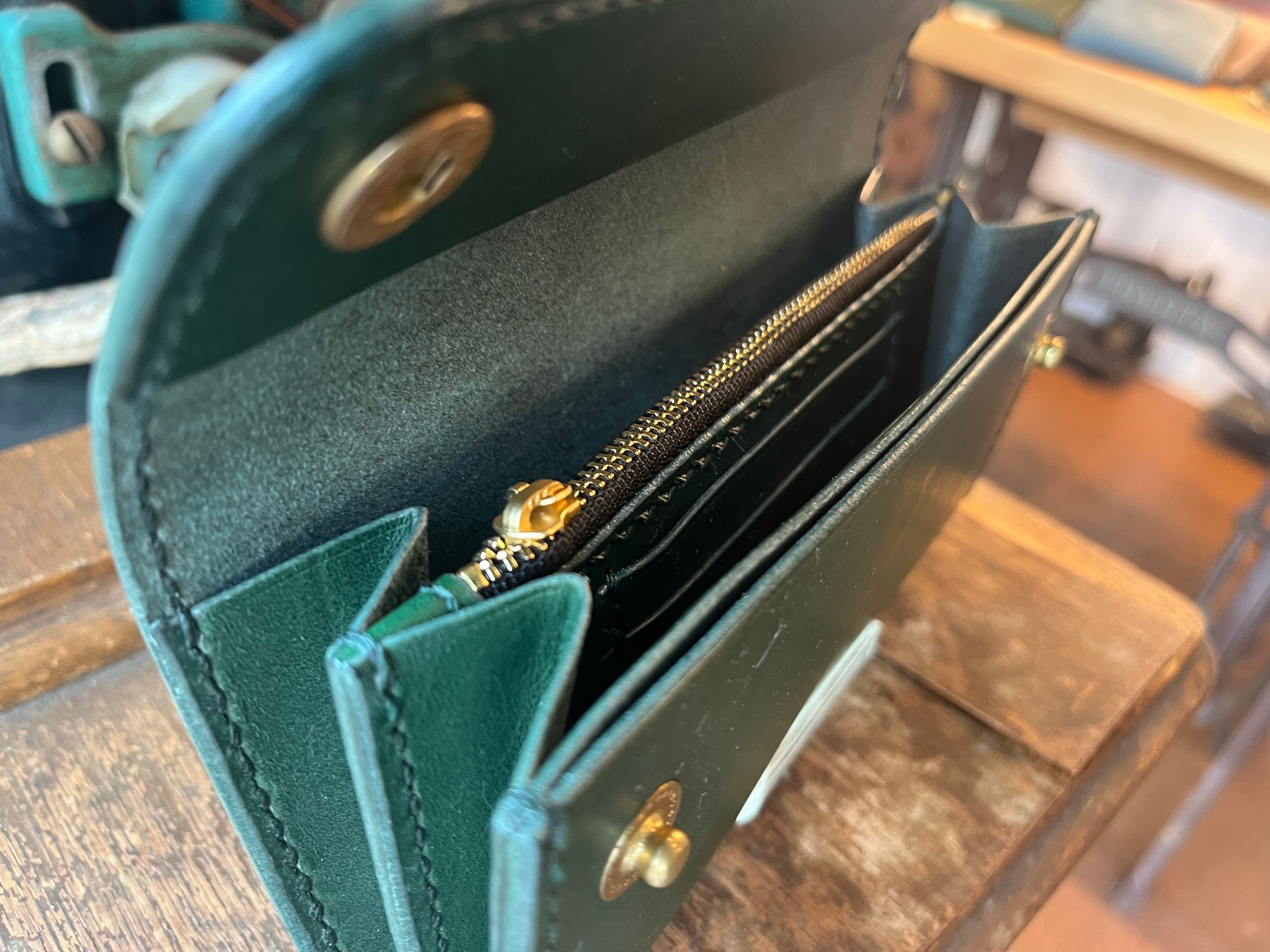 かぶせロングウォレットのミドルサイズが登場。 カードポケットが4箇所と、フリーポケットが3箇所、コインポケットが1箇所とコンパクトで持ちやすいミドルウォレットとなっています。 18×9.5cm 金具真鍮製。