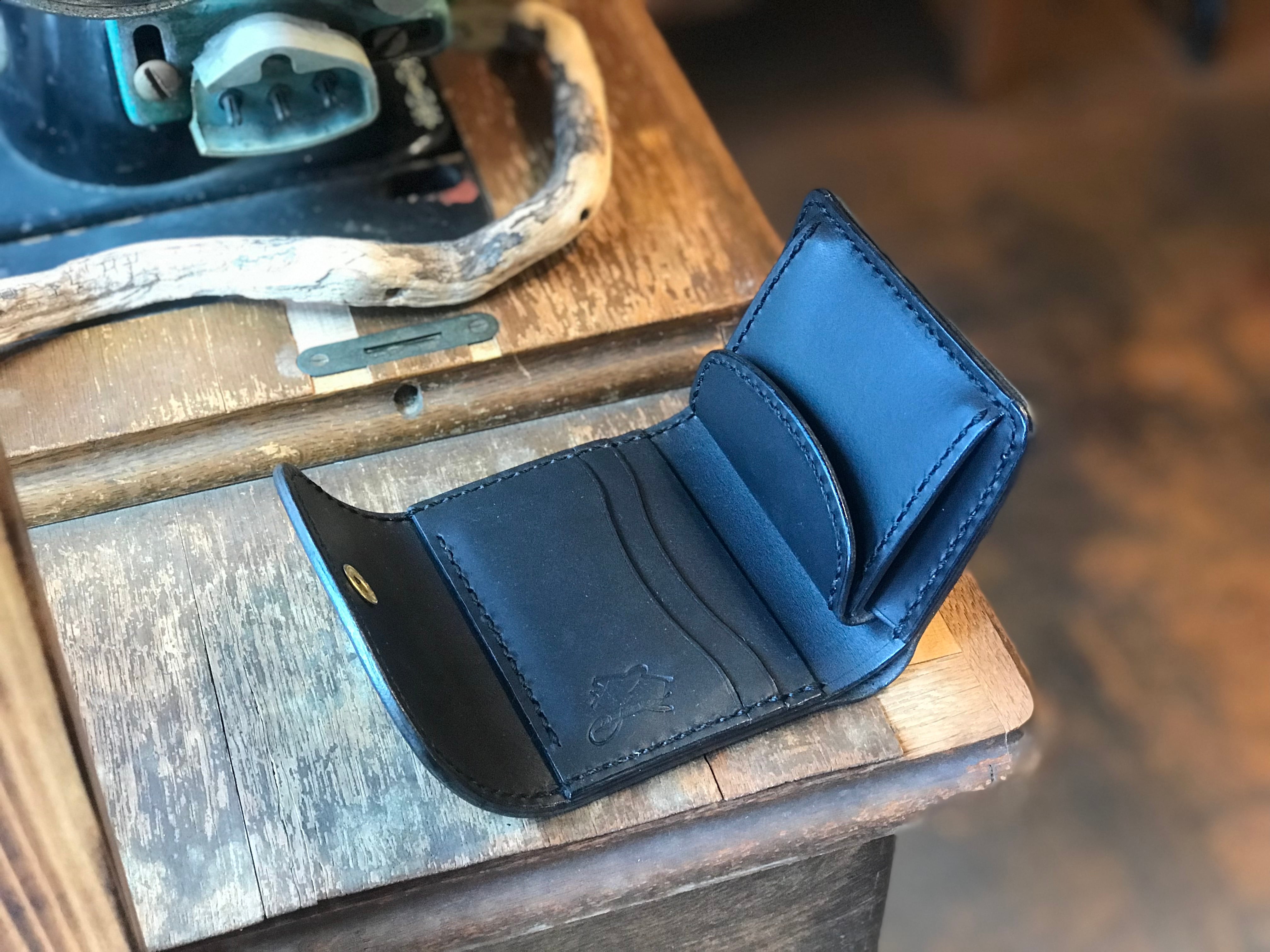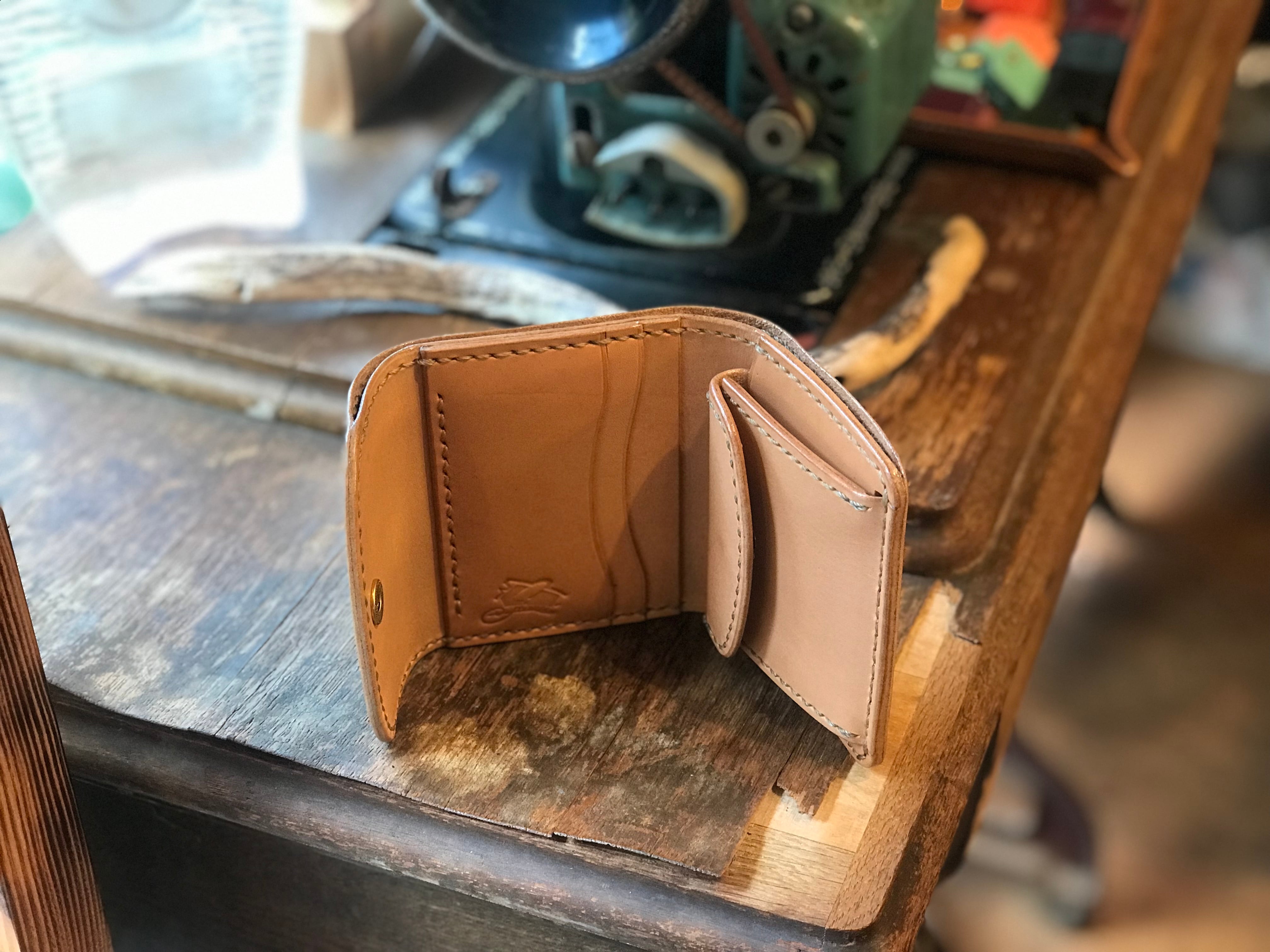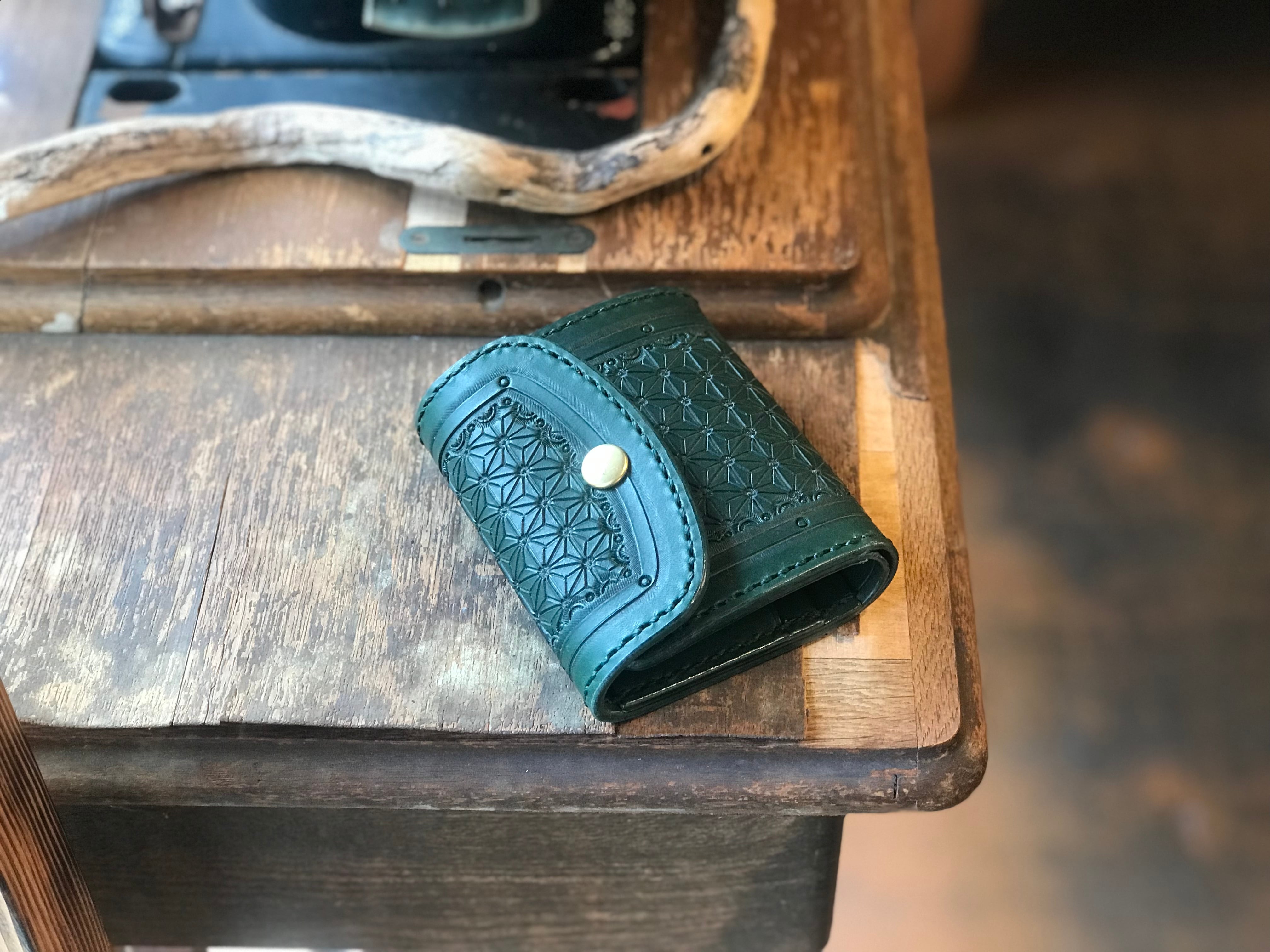 線彫り麻柄を入れた三つ折り財布。 構造、サイズ等拘り手縫いにて一つ一つ丁寧に仕上げております。